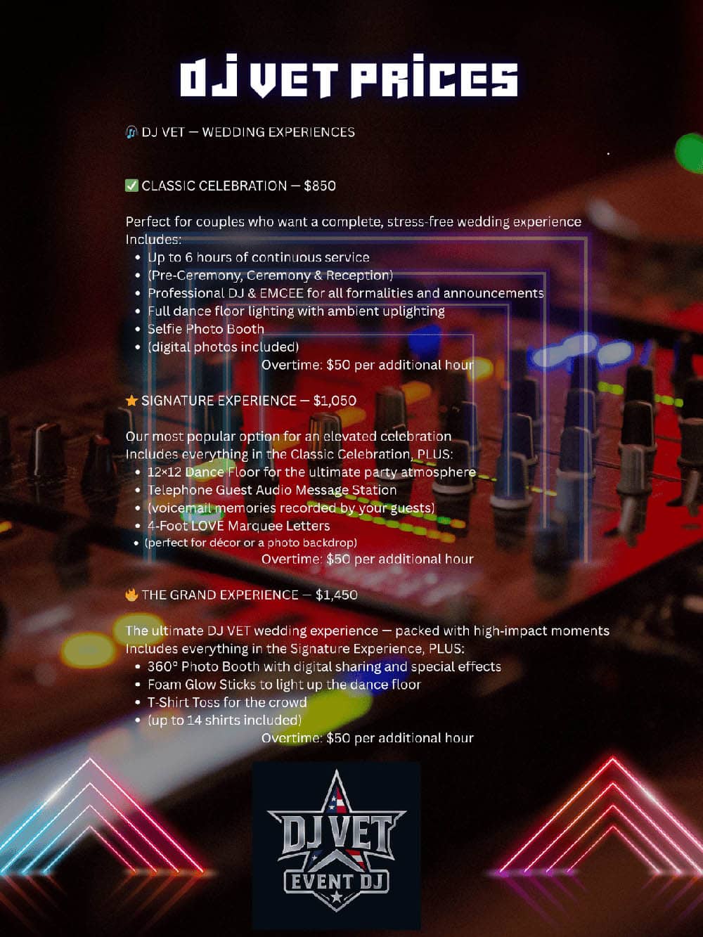 As a Veteran‑Owned Mobile DJ, DJ VET is committed to delivering a professional, high‑energy entertainment experience for weddings, parties, and special events. With a vast music library, top‑of‑the‑line sound and lighting equipment, and years of event experience, we create unforgettable moments tailored to your vision.